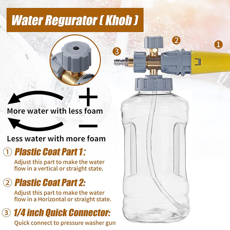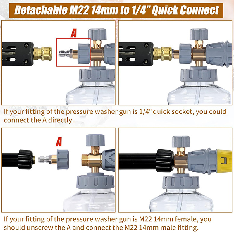 UNIVERSAL QUICK CONNECTOR - Denna skumkanon Àr utrustad med en standard 1/4" snabbkoppling och en medföljande M22-14 mm adapter, vilket gör att den enkelt kan anslutas till en mÀngd olika högtryckstvÀttpistoler för en sÀker och lÀckagefri anslutning.