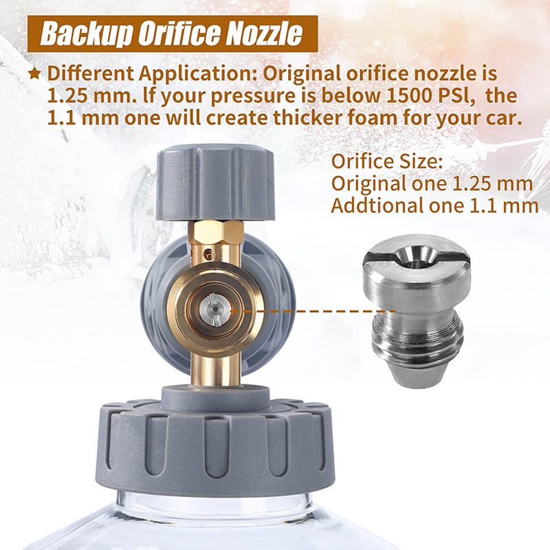 DUBBLA MUNSTYCKEN â Levereras med ett förinstallerat munstycke pĂ„ 1,25 mm och ett extra munstycke pĂ„ 1,1 mm. Detta gör att du kan optimera skumproduktionen för din specifika högtryckstvĂ€tt, vilket garanterar maximal skumtjocklek Ă€ven med enheter med lĂ€gre PSI.